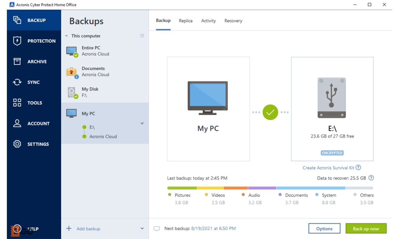 Store backups locally on drives or upload to secure Acronis Cloud for remote protection.